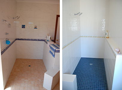 In both bathrooms we have "open" showers, (in Britain called a "wet room"), that is without a shower enclosure or hob. If you plan something similar, make sure that you get the tiler to provide enough slope on the floor to the drain, at least double what they are used to providing in a shower cubicle, and make sure that the slope extends out to the surrounding walls and at least a metre from the floor drain where there is no immediate wall. To achieve this the concrete slab in the wet areas ideally needs a 25 millimetres or so set down (but this should not be allowed to compromise the slab thickness).