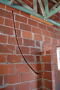On internal brick walls the standard practice is to run electrical cables (and plumbing pipes) in conduit "chased" into the brickwork. The wall is then plastered over, which hides the location of these cables. Generally, you can expect the electrician to take a cable vertically from a power point or switch up to the roof space, but this is not always the case. Sometimes he (or she) may go off-line a bit, or, as in the picture on the right, take a non-linear path, in this case to avoid cutting in to the end of a reinforced brick lintol which spanned the opening to our computer room.