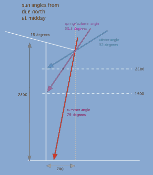 To get the design right, we drew a diagram (with the ever-useful drawing package) of the sun angles at our latitude and with the slope of our roof (see graphic, right). It shows that at midday in the middle of summer, with 700 millimetre eaves, the sun will not hit the walls of the house at all. In spring and autumn it will be 1600 millimetres up the wall, and in mid-winter it will extend up to 2200 millimetres.