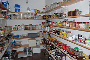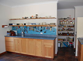 People's ideas on what constitutes a good kitchen design vary a lot, which is reasonable because this is an area where everyone has different requirements; but for us it is a work area rather than a space for socialising and so our design has some similarites with a commercial kitchen. We have a double sink seamlessly built in to a stainless steel benchtop, and a stainless steel benchtop for the gas cooktop. All our commonly-used plates, crockery and cooking implements are on display on shelves and hooks above the main working benchtop and so are very easy to get at and put away.