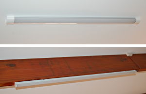 In our quite large kitchen we put in two 36 watt LED lights which look like a neater lower-profile version of the old 1200 millimetre long fluorescent fittings (top picture), and together they provide brilliant, even illumination for the whole room. I do not think that there is any significant metal in their construction so they will not rust and there is no paint to peel. In addition we do have one downlight directly over the sink (the only downlight in the house) and strip lighting over the work benches, where the shelves above the bench and our bodies when working there would otherwise tend to create shadows from the ceiling lights.