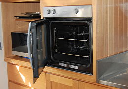 After having an under-bench oven in our previous house, to protect our backs and knees we determined that we would have one at bench height in this house. To make it easier to use, we also wanted a side-opening door. For some reason this arrangement is not common, and so the choice available was quite limited, especially if very expensive imported ovens were excluded. But now that we have a side-opening door oven, we are at a loss to understand why all ovens do not operate that way (as it seems all microwave ovens do). The door mechansism is much simpler and getting things in and out of the oven is a lot easier, as is access for cleaning.