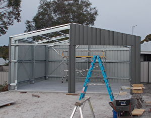 We knew that access to the rear of our block would be more difficult once serious building got under way, and we wanted somewhere to store tools and materials and to provide shelter from the weather while the build was progressing. So our first task was to erect a six metre square shed at the rear of the property. The concreters put down the slab and we looked for the cheapest kit that we could find. Once it was delivered we assembled our "build team" - a friend who renovated old houses, his brother-in-law (a temporaily unemployed professional engineer), his son (the muscle) and a friend who was a specialist metalworker. You could not imagine a more suitable group of people for the task.
