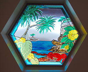 The windows which at the end of the build received "stained glass" (in fact a combination of fused glass and copper foiling) were initially constructed and installed in exactly the same way as all the other aluminium-framed windows, so they were always weather and insect proof. The stained glass panels were installed behind the clear glass, separated by a foam strip around the edge. This is important to allow for expansion and contraction of the glass. The panels were held in place by timber beading (also with an edge foam strip) screwed sideways into the aluminium frame, which was over 50 millimetres wide and so more than wide enough for this to work.
