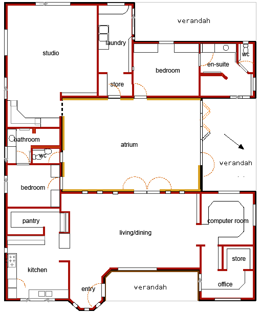 Our house is single-story with a basic plan as shown below. The total area including verandahs but excluding the carport is about 350 square metres. You will see that the two largest rooms are the atrium and the studio, neither of which would even exist in most modern Australian house design. But they reflect our lifestyle - the studio has turned out to be Kaye's favourite room and she spends a lot of time there. The atrium (jokingly refered to as our over-size corridoor) is filled with plants and has an expansive view of the patio garden - some compensation for having to move from the wide open spaces of the farm.