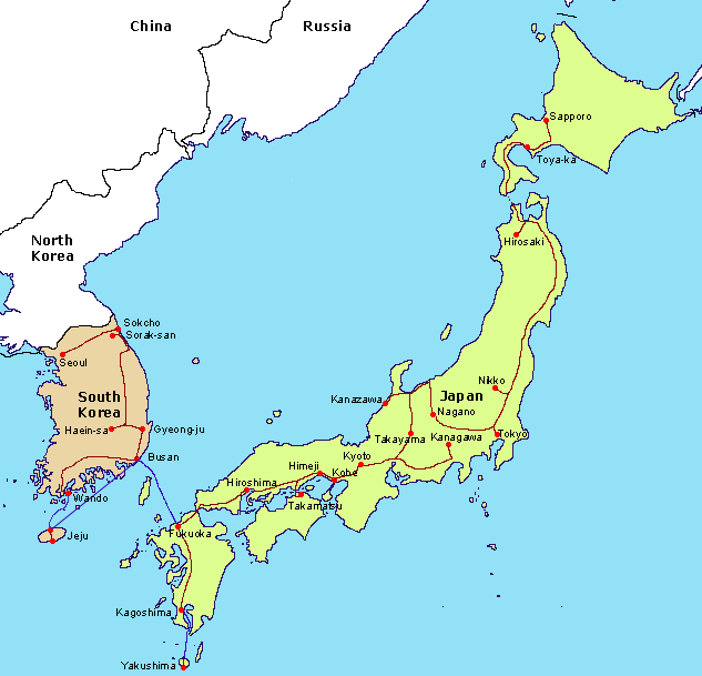 So on the way to Japan we flew to Hong Kong and then on to South Korea. Within South Korea we travelled by bus on the mainland, took the ferry to Jeju, but flew back to Busan/Pusan to save time - it would have taken two days to backtrack on our ferry/bus journey to get there. We took the ferry to Japan.