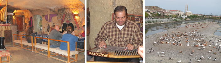 The pension recommended to us was in Avanos, on the edge of the area we would want to explore, but we decided to go there anyway. It was a good choice, but it helped that I could speak French, since this was a place favoured by French tourists, and we were the only English speakers staying there. Meals were wonderful, eaten in an underground cave, and our evening meals were accompanied by live music - qanun, drums and singing, all superb.