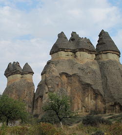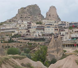 Another bus ride took us to Uchisar, a mound of castle-like proportions, hollowed out into houses, chapels, stores and many things besides, with a town huddled around its base. We took our time walking around the place, then decided to walk back to Goreme rather than try to find the bus again. The weather had been changing, and we took our time walking, stopping to admire formations along the way, so that by the time we were on the outskirts of Goreme it began to rain. We only just reached the shelter of the shops before it poured down, and we had a long, wet wait for a bus back to Avanos.
