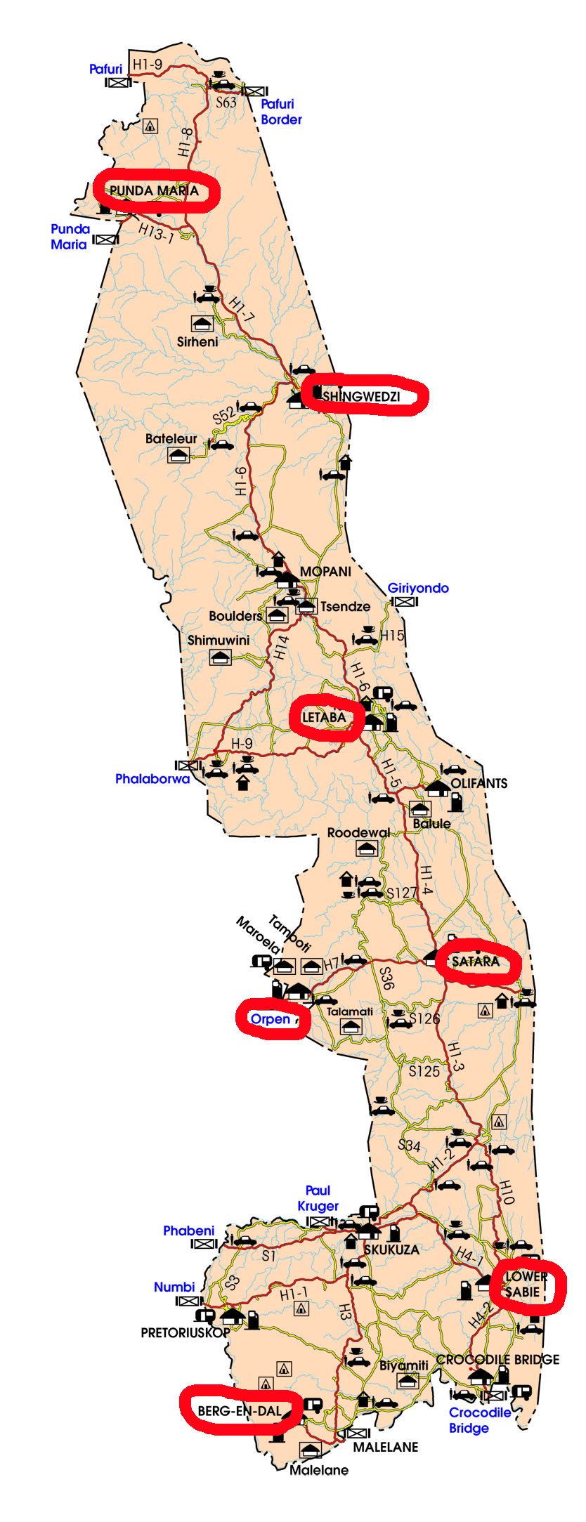 Kaye had previously spent a week in Kruger with her sister and their South African friend Judy, but Geoff had only visited the National Park on a day trip many years ago. This time we were to spend eleven nights in the park, driving from the northernmost gate (Pafuri) to the most southerly (Crocodile Bridge).