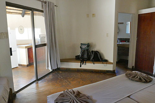 This area of more open grasslands is known for its elephants and its large herds of buffalo. There were also lots of buck, and hippos in the rivers. This was also the area where we saw our first lion. We were driving along slowly when two warthogs raced across the road in front of car, followed by a lioness, which stopped on the road, walked briefly towards us, then retraced her steps back into the riverbed. We had two cabins at the camp, giving us all a bit more room and privacy.