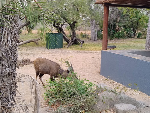 The bush around Satara is relatively open, and it is said to be a good place to see big cats. The identical camp buildings are set out in a series of circles, causing us to drive around and around at times trying to find our accommodation! We had a wonderful viewing of a family of hyenas out from Satara. It had just rained, and the entire family were out on the sealed road licking the fresh water from the surface. They had a den in a culvert under the road, and there were animals of all ages. A lot of cars had stopped on the road with everyone watching, but the hyenas took little notice of all of us staring humans - they walked in and out of the traffic, sat under cars, and licked the water up as it pooled. This area also had several good water holes where a variety of animals came in to drink. We went on a late afternoon organised drive where a pride of lions decided to lie down on the road and stop the traffic completely. Back at the camp there were bush buck wandering around doing their pruning work again.